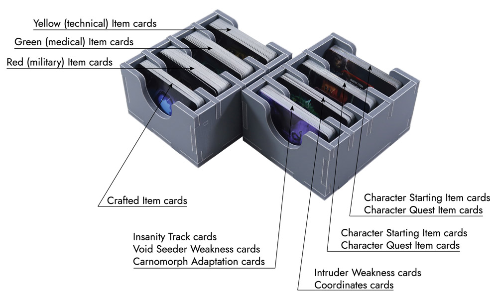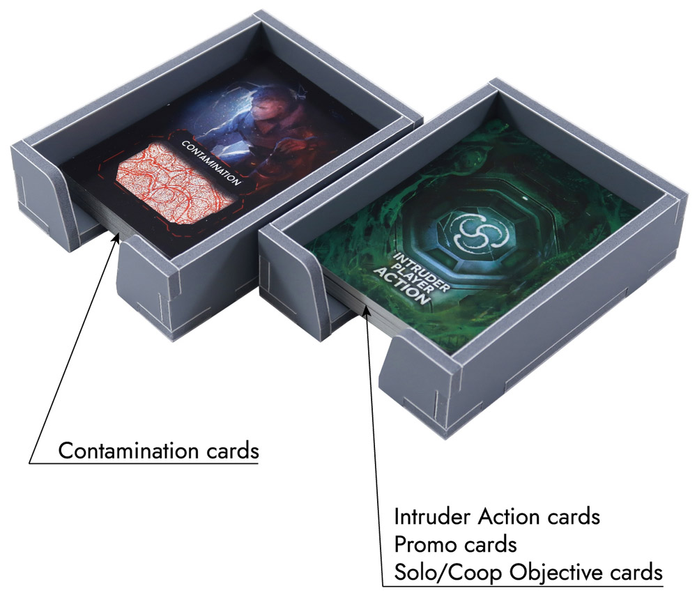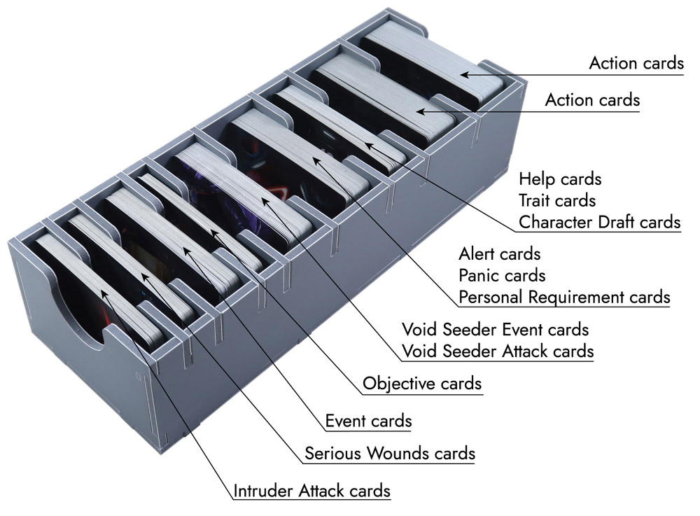 The insert includes one large card tray which goes in the base of the box. This tray is removable and all card trays have space for sleeved cards. The card trays have space for the base game  cards and those from Nemesis: Aftermath & Void Seeders® expansion.