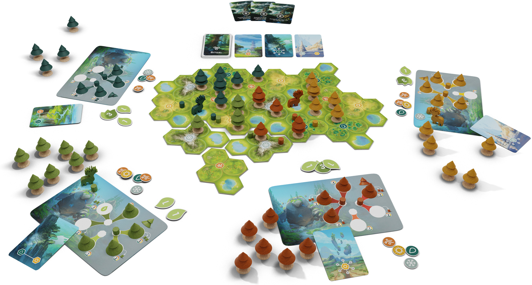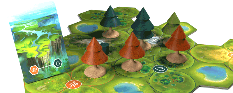 In Forests of Pangaia, you grow your own forest and contend with other players for territory. Strategic choices are crucial along the way. Will you keep your forest calm and isolated or mingle with others to reap the benefits gained from diversity?